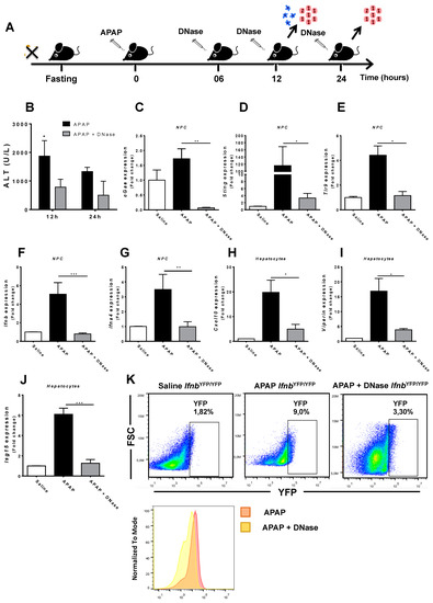 DNase treatment after hepatic injury induction. (A) Scheme showing APAP treatment time points (600 mg/kg) and DNase (1000 U/L) in mice over time. (B) ALT serum levels to assess hepatic injury at 12 and 24 h after DNase treatment. (C–G) Gene expression of different sensors in hepatic non-parenchymal cells between treated and non-treated groups with DNase. Cells were collected 12 h after administration of APAP (600 mg/kg) and relative expression was done using control NPCs (saline) as a reference. (H–K) Gene expression of different sensors in hepatocytes between DNase-treated and non-treated groups. (K) Flow cytometry to evaluate IFN-I production by non-parenchymal liver cells in DNase-treated and untreated groups. Cells were collected from IFNYFP/YFP mice 12 h after administration of APAP (600 mg/kg). (Mean ± SEM; n = 4); * p ≤ 0.05, ** p ≤ 0.01 and *** p ≤ 0.001. The relative gene expression was done using saline hepatocytes as a reference.