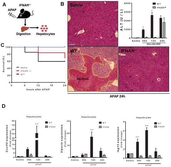 IFN-I production aggravates hepatic injury. (A) Scheme showing hepatocyte isolation from IFNAR−/− mice challenged with APAP. (B) Liver histology and serum ALT levels of IFNAR−/− mice 24 h after APAP (600 mg/kg) administration (HE staining). (C) Survival rate in IFNAR−/− mice after APAP (600 mg/kg) administration. (D) Expression of viperin, Isg15 and Cxcl10 in IFNAR−/− mouse hepatocytes in comparison to wild-type cells 6, 12, and 24 h after APAP administration. (Mean ± SEM; n = 5); * p ≤ 0.05 and *** p ≤ 0.001. Scale bar = 200 μm.