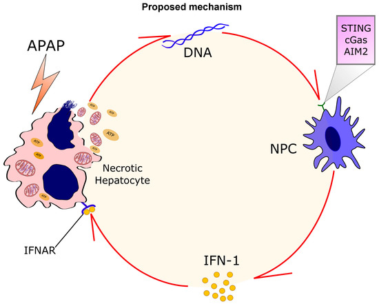 During postnatal growth, the liver undergoes dramatic changes that are characterized by a gradual enhancement of both nuclei number and DNA content per cell [6]. This may be explained by the several cycles of cell division that hepatocytes have, which favor the generation of polyploid cells [7]. Interestingly, such successive division may give rise to tetraploid and octoploid cells harboring one or two nuclei. The rate of polyploid cells increases over the aging process but can also be triggered by cellular stress (hepatectomy), toxic stimulation, and metabolic overload during changes in diet [6,8]. In fact, these tenets hold true for both mouse and humans. In this context, the liver has one of the major populations of polyploid cells within the body, and mature hepatocytes may have up to 16 copies of the genome; a substantial part of cell weight may be due to DNA mass [9]. It is, therefore, reasonable to hypothesize that massive hepatocyte necrosis, such as that observed during APAP overdose, will offer large amounts of extracellular DNA. This induces the immune system activation via a plethora of different DNA sensors that are expressed by these cells, including stimulator of IFN genes (STING), cyclic guanosine monophosphate-adenosine monophosphate synthase (cGAS), Toll-like receptor 9 (TLR9), and others. Recognition of self or exogenous DNA within the membrane via cytoplasmic sensors usually suggests pathogenic invasion [10,11]. However, self-DNA trafficking may occur in both physiological and pathological situations. Upon DNA sensing, several innate immune DNA-sensing pathways trigger an antimicrobial type 1 interferon (IFN) response, which also may include other cytokines (Tumor Necrosis Factor (TNF)-α, Interleukin (IL)-6, IL-1B, MCP-1, and others) [12]. This response, which initially can enhance host protection, could also become damaging if it is improperly activated by self-DNA as occurs during necrosis [13,14].