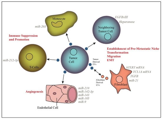 Release of EVs by tumor cells is believed to play a major role in intercellular communication, facilitating signaling to surrounding tumor cells and to distant sites via blood or other biological fluid transportation (Figure 1). A primary focus of inquiry has been the impact of EVs on the tumor stroma, including fibroblasts, endothelial cells, and immune cells.