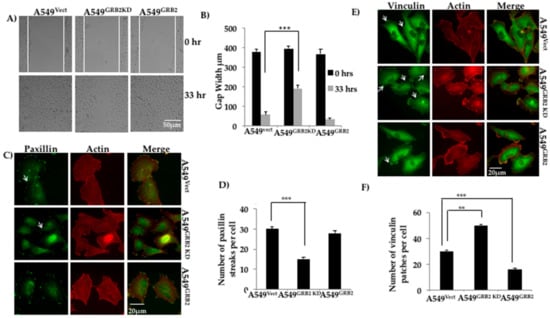 3.3. GRB2 Promotes Cell Migration and Reduced Vinculin Localisation in A549 Cells