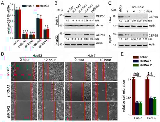 3.3. CEP55 Knockdown Suppresses the Motility Activity of HCC Cells