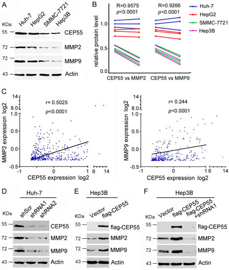 3.4. CEP55 Promotes Expression of MMPs in HCC Cells