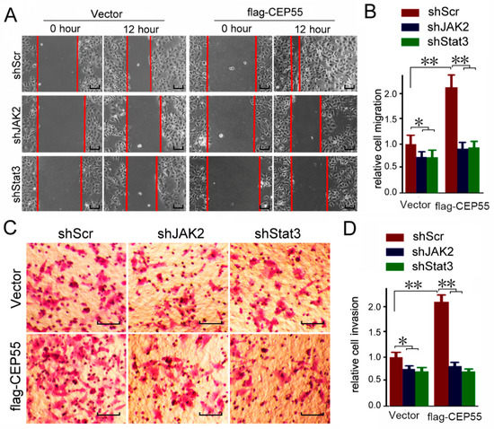 3.6. JAK2 or STAT3 Blocking Abrogates the Pro-Migration and Pro-Invasion Effects of CEP55