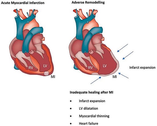 Despite significant advances in pharmaceutical and interventional therapies, the irreversible loss of functional CMs is still a critical issue. After ischemic heart disease, the dense collagenous scar replacing contractile CMs undergoes progressive negative remodelling, which impacts myocardial contractility and electrical conduction (Figure 1) [].