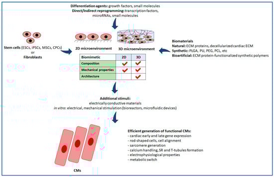 Schematic representation of CM generation. Functional and mature CMs can be obtained starting from different cell sources: through cardiac differentiation of stem cells (ESCs, iPSCs, MSCs and CPCs) or fibroblast direct and indirect reprogramming into CMs. These processes are mainly guided by differentiation agents (growth factors and small molecules) or reprogramming agents (TFs, microRNAs and small molecules). Cell differentiation and reprogramming can be performed in the presence of biomaterials, which are classified as natural (ECM proteins and decellularized cardiac ECM), synthetic (PLGA, PU, PEG, PCL, etc.) and “bioartificial” (ECM protein-functionalized synthetic polymers) using a 2D or 3D microenvironment. 3D cell culture offers a structure that mimics natural microenvironment. Additional stimuli for CM generation can be provided by electrically conductive materials or electrical and mechanical stimulation in bioreactors and microfluidic devices. Peculiar features of functional CMs assess the level of CM maturation.