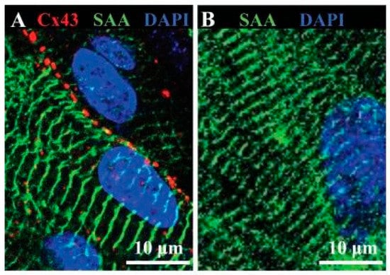 - Angst, B.D.; Khan, L.U.; Severs, N.J.; Whitely, K.; Rothery, S.; Thompson, R.P.; Magee, A.I.; Gourdie, R.G. Dissociated spatial patterning of gap junctions and cell adhesion junctions during postnatal differentiation of ventricular myocardium. Circ. Res. 1997, 80, 88–94. [Google Scholar] [CrossRef] [PubMed]