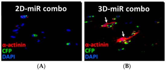 Representative immunostainings of neonatal cardiac mouse fibroblasts transfected with miR combo on 2D (A) and 3D (B) environment. 3D fibrin-based hydrogels (right panel) supported fibroblast reprogramming into CMs increasing α-sarcomeric actinin expression compared to 2D culture (left panel) after 14 days culture time. Reproduced from Li et al. [].