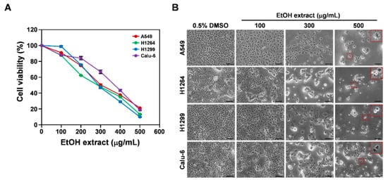 The EtOH extract of the sclerotia of P. cocos reduces cell viability in human lung adenocarcinoma cells, regardless of the p53 status. (A) Cell viability assessed with the WST-1 assay in four human lung adenocarcinoma cell lines, A549, H1264, H1299, and Calu-6, 48 h after treatment with the EtOH extract at the indicated concentrations. (B) Representative bright-field images (200× total magnification) of human lung adenocarcinoma cells treated with the EtOH extract at the indicated concentrations for 48 h. Magnified regions are shown as insets. Data are presented as means ± SEMs. Scale bar: 100 μm.