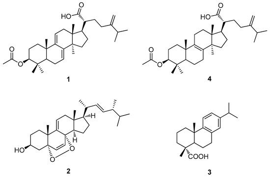 To determine the major components of the sclerotium of P. cocos contributable to its cytotoxicity against human lung cancer cells, the EtOH extract was fractionated into four different fractions (hexane-soluble, CH2Cl2-soluble, EtOAc-soluble, and n-BuOH-soluble fractions), and sequentially analyzed by LC/MS. The hexane-soluble fraction was found to contain the main constituents. This fraction was chemically investigated by repeated column chromatography and HPLC techniques (see Supplementary Materials), where two triterpenoids (1 and 4), a sterol (2), and a diterpenoid (3) were successfully isolated (Figure 3). Through comparison of spectroscopic and physical data of the isolates with those previously reported, along with LC/MS analysis, the triterpenoids were identified as dehydroeburicoic acid monoacetate (1) [26] and acetyl eburicoic acid (4) [27], the sterol was identified as 9,11-dehydroergosterol peroxide (2) [28], and the diterpenoid was identified as dehydroabietic acid (3) [29].