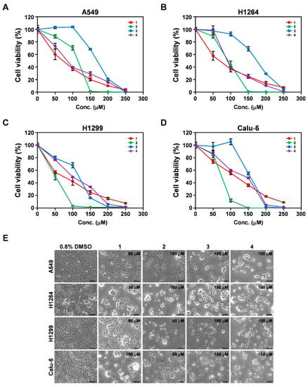 Cytotoxicity of compounds isolated from the EtOH extract of the sclerotia of P. cocos toward human lung adenocarcinoma cells. (A–D) Cell viability in A549 (A), H1264 (B), H1299 (C), and Calu-6 (D) cells, assessed with the WST-1 assay 48 h after treatment with the isolated compounds (1–4) at the indicated concentrations. (E) Representative bright-field images (200× total magnification) of human lung adenocarcinoma cells treated with the isolates at the indicated concentrations or 0.8% DMSO as a vehicle control. Data are presented as means ± SEMs. Scale bar: 100 μm.