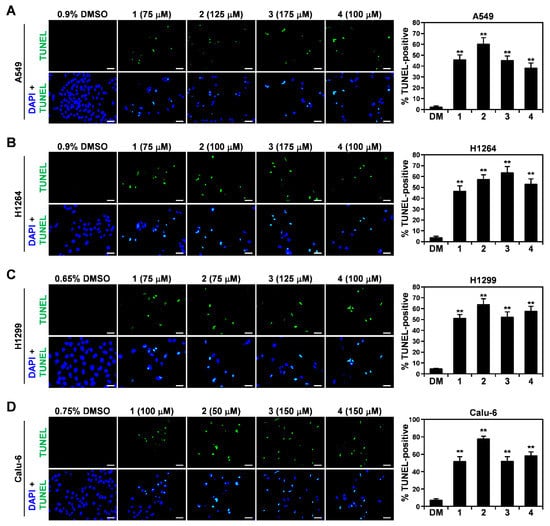 Pro-apoptotic effects of isolated compounds 1–4 in human lung adenocarcinoma cells. (A–D) Representative fluorescence images (400× total magnification) of TUNEL (green) and DAPI (blue) staining (left), and quantitation of TUNEL-positive cells (right), in A549 (A), H1264 (B), H1299 (C), and Calu-6 (D) cells treated with the compounds (1–4) or DMSO (DM) as a vehicle control at the indicated concentrations for 48 h. Data are presented as means ± SEMs. Scale bar: 50 μm. ** p < 0.01.