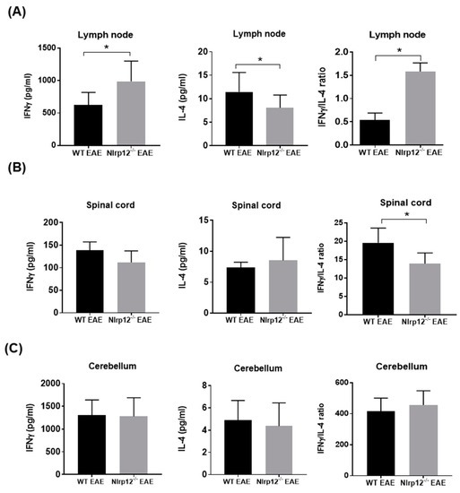 Nlrp12 inhibits Th1 response in Experimental Autoimmune Encephalomyelitis (EAE). Th1- and Th2- related cytokines in tissue lysates from EAE mice. Central nervous system (CNS) tissues and lymph nodes were collected from EAE mice after 3 weeks of immunization with myelin oligodendrocyte/complete Freund’s adjuvant (MOG/CFA). The tissues were homogenized in lysis buffer and cytokine levels were measured in tissue lysate by ELISA. (A) The levels of IFNγ, IL-4 and IFNγ/IL-4 ratio in lymph node extracts from WT and Nlrp12−/− EAE mice; (B) The levels of IFNγ, IL-4 and their ratios in the spinal cord and (C) cerebellum of EAE mice, n = 5–6 per group, * p < 0.05.