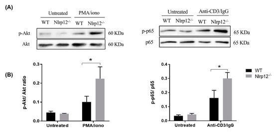 Since multiple signaling pathways are involved in T cell activation and proliferation, we hypothesized that signaling pathways were inhibited by Nlrp12 in activated T cells. It is well-established that TCR activation triggers calcineurin (a Ca2+/calmodulin-dependent phosphatase), MAPK and NF-κB signaling pathways, leading to the activation of the nuclear factor of activated T cell (NFAT), AP1 and NF-κB transcription factors that initiate IL-2 transcription [22]. In this regard, we evaluated the phosphorylation of p65 (NF-κB subunit) and Akt in activated CD4+ T cells. Western blot results demonstrated a significant increase in the phosphorylation of p65 in activated Nlrp12−/− T cells compared to WT T cells, highlighting the inhibitory effect of Nlrp12 on NF-κB signaling pathway (Figure 10). These results are in agreement with previous studies that show Nlrp12 suppresses canonical and non-canonical NF-κB pathways [16,20,32,33].