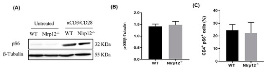 Nlrp12 does not modify mTOR activity. (A) The phosphorylation of S6 ribosomal protein (pS6) as an indicator of mTOR activity was assessed by Western blotting; (B) The ratio of pS6 to β-Tubulin in WT and Nlrp12−/− CD4+ T cells activated with anti-CD3/CD28 for 24 h, as quantified by Western blot, n = 3; (C) Phospho-flow analysis of pS6 in CD4+ T cells activated with anti-CD3/CD28 for 24 h, n = 3.