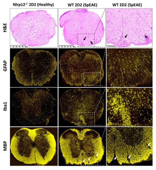 SpEAE in WT 2D2 mice is associated with spinal cord inflammation and demyelination. Representative histopathological examination of the spinal cords from healthy Nlrp12−/− 2D2 mice and spEAE WT 2D2 mice. H&E staining reveals an extensive mononuclear cell infiltration to the spinal cord of spEAE mice (shown by black arrows). Immunofluorescent staining of spinal cords from WT 2D2 spEAE shows an increased expression of GFAP (astrocyte marker) and Iba1 (macrophage/microglia marker) mice compared to Nlrp12−/− 2D2 healthy mice. Focal demyelinating lesions (shown by white arrows) are observed in spEAE spinal cords using MBP staining. Similar histopathological features to healthy Nlrp12−/− 2D2 mice were found in healthy WT 2D2 mice (images not shown).
