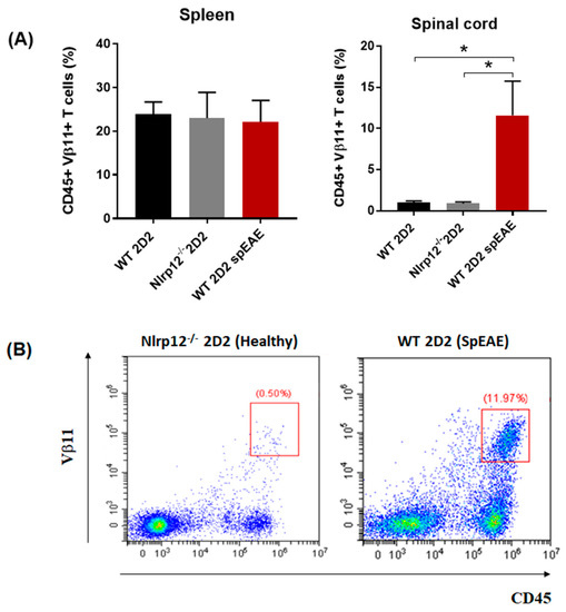 Myelin-specific T cells infiltrate to the spinal cord of spEAE mice. (A) The percentage of T cells expressing myelin-specific transgenic TCR (Vβ11+) were comparable in the spleen of healthy and spEAE mice, however, the percentage of Vβ11+ T cells were increased in the spinal cord of spEAE mice compared to WT healthy and Nlrp12−/− healthy mice (n = 6), * p < 0.05; (B) Representative flow cytometry plots of CD45+ Vβ11+ T cells in the spinal cord of Nlrp12−/− 2D2 healthy and WT 2D2 spEAE mice.