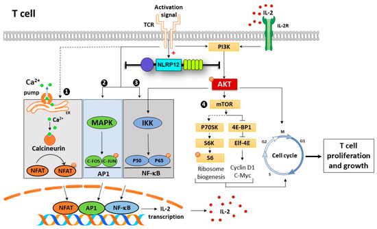 Possible mechanism of action of Nlrp12 in regulating early TCR signaling pathways, T cell activation and proliferation. Activation signals from TCR activates multiple downstream signaling pathways in T cells, presented as (1) NFAT, (2) NF-κB, (3) MAPK and (4) mTOR pathways. These pathways lead to nuclear translocation of NFAT, NF-κB and AP1 transcription factors and IL-2 transcription. IL-2 binds to its receptor on the cell surface and initiates mTOR pathway. TCR activating signals induce the expression of Nlrp12 that consequently inhibits NF-κB and MAPK signaling pathways, which suppress IL-2 production. Upstream of NF-κB pathway, Nlrp12 inhibits Akt phosphorylation that controls NF-κB signaling on one side and mTOR activity and cell cycle progression on the other side. Taken together, Nlrp12 has a broad range of regulatory activity that controls hyper-proliferation and activation of T cells. The pathways shown in dashed lines are not affected by Nlrp12 including NFAT signaling and mTOR/S6 phosphorylation.