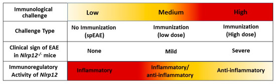 Dual immunoregulatory function of Nlrp12 in EAE. The severity of immunological challenge, ranging from low to high, can influence the regulatory function of Nlrp12 in EAE. In this model, when there is no MOG/CFA immunization, myelin-specific T cells face a low level of challenge. In this case, Nlrp12 plays an inflammatory role, which explains why WT 2D2 mice developed spEAE and Nlrp12−/− 2D2 mice were resistant to spEAE. On the other hand, with MOG/CFA immunization, T cells encounter immunological challenge that may vary from medium to high levels. In mild challenge, perhaps with lower dose of MOG-CFA immunization, Nlrp12 is a bifunctional molecule, acting as an inflammatory or anti-inflammatory molecule. In this condition, EAE mice developed mild EAE signs, mostly atypical symptoms such as ataxia [20]. When MOG/CFA immunization provides high levels of immunological challenge, Nlrp12 acts as an anti-inflammatory molecule, inhibiting severe signs of classical EAE [19]. Given the fact that Nlrp12 ligand is still unknown, what exactly tunes Nlrp12 response as a pro–inflammatory or anti-inflammatory molecules, needs further investigation.