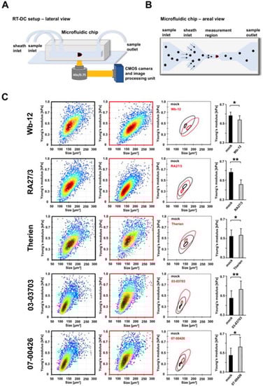 - Golfier, S.; Rosendahl, P.; Mietke, A.; Herbig, M.; Guck, J.; Otto, O. High-throughput cell mechanical phenotyping for label-free titration assays of cytoskeletal modifications. Cytoskeleton 2017, 74, 283–296. [Google Scholar] [CrossRef] [PubMed]