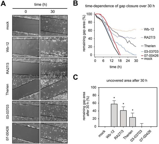 RV perturbs wound healing capacity of Vero cells. (A) Representative images of wound healing assay taken at 0 h and 30 h. Black dotted lines indicate the insert borders at the beginning of the assay and live cell images were recorded at 15-min intervals for 30 h. (B) Quantitative analysis of the time dependence of gap closure. The percentage of remaining gap area was calculated as the ratio of the remaining gap at the given time point and the original gap present at 0 h. The quantified values are presented as mean of three independent experiments (two positions per individual experiments). (C) Quantification of remaining gap area after 30 h. The quantified values were represented as mean ± SD of 3 independent experiments (two positions per individual experiment). * p < 0.05 vs. mock group.