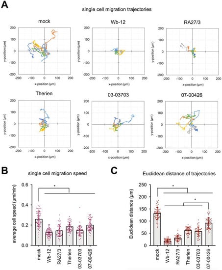 For further assessment of the reduction in migration capacity of RV-infected Vero cells, single cell migration assays were performed. Mock- and RV-infected Vero cells were re-plated on cell tissue culture plate at 48 hpi. After an incubation of 12 h live cell imaging was performed at 15-min intervals for 30 h under standard cell culture conditions. Single cell migration was automatically analyzed using a custom-made image analysis toolbox []. Representative trajectories of single cells shown in Figure 4A indicate that all RV strains triggered a significantly reduced migratory speed and Euclidean distance (straight distance between start and end point of cell trajectory). Under RV infection, the average migration speed was below 0.2 µm/min as compared to uninfected cells (average migration speed of 0.26 µm/min), (Figure 4B). While the reduction in single cell migration speed of RV-infected Vero cells was comparable among RV strains, analysis of Euclidean distance (Figure 4C) revealed a stronger reduction for cells infected with group one strains (Wb-12 and RA27/3) compared to mock or group two infection. Although cells infected with 07-00426 strain did not show any changes in collective cell migration in the wound healing assay, cell speed and Euclidean distance of single cell migration were significantly reduced compared to mock-infected cells. To demonstrate the importance of actin filaments and their organization for single cell migration, we treated Vero cells with cytochalasin D at a concentration of 0.5 µM. As shown in Supplement Figure S4, cells treated with cytochalasin D exhibited a strong impairment of cell migration, including cell migration trajectories (Figure S4B) and speed (Figure S4C).