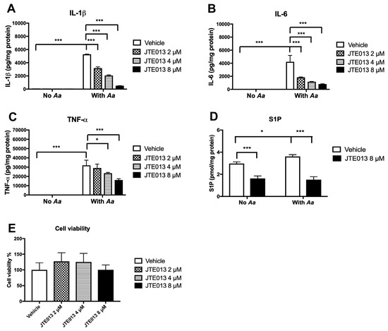 Inhibition of S1PR2 by its specific antagonist (JTE013) significantly decreased IL-1β, IL-6, TNF-a, and S1P levels induced by Aa in BMMs. Murine BMMs were treated either with vehicle or JTE013 for 30 min. Then cells were either uninfected or infected with Aa for 6 h. (A) IL-1β, (B) IL-6, and (C) TNF-α levels were quantified by ELISA. (D) S1P levels in cell protein lysates were quantified by mass spectrometry. Cytokine and S1P levels were normalized by protein levels in cell lysates. (E) Cell viability in BMMs treated with vehicle or JTE013 for 24 h. (* p < 0.05 *** p < 0.001).