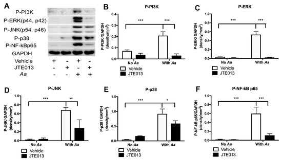 Inhibition of S1PR2 by its specific antagonist (JTE013) attenuated p-PI3K, p-ERK, p-JNK, p-p38, and p-NF-kBp65 protein expressions induced by Aa in BMMs. Murine BMMs were treated with either vehicle or JTE013 for 30 min. Then cells were either uninfected or infected with Aa for 4 h. (A) p-PI3K, p-ERK, p-JNK, p-p38, p-NF-κBp65, and control GPADH protein expressions were evaluated by western blot. (B) p-PI3K protein density, (C) p-ERK protein density, (D) p-JNK protein density, (E) p-p38 protein density, and (F) p-NF-κBp65 protein density were analyzed and normalized by GAPDH protein expression. (* p < 0.05, ** p < 0.01, *** p < 0.001).