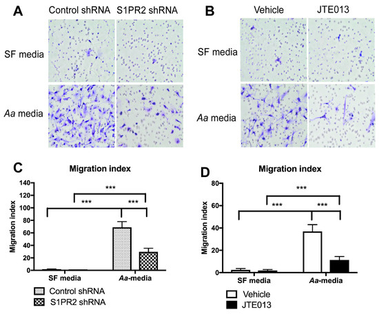S1PR2 regulates cell chemotaxis induced by Aa-stimulated cell culture media. Murine BMMs, treated with either S1PR2 shRNA, control shRNA, JTE013, or vehicle, respectively, were loaded on the top inserts of transwell plates. The bottom chambers were filled with either serum-free (SF) media or Aa-stimulated cell culture media (Aa-media) as described in Methods. Cells were incubated for 6 h. (A,B) Representative images show crystal violet staining of cells on the bottom of inserts. (C,D) display migration index. (*** p < 0.001).