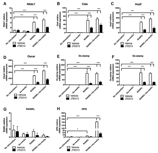 Our previous study [23] demonstrated that knockdown of S1PR2 by a specific S1PR2 shRNA significantly reduced the mRNA levels of osteoclastogenic genes—including Nfatc1, Ctsk, Acp5, Oscar, Dc-stamp, and Oc-stamp—in total BM cells three days after RANKL treatment. To further determine the role of the S1PR2 antagonist (JTE013) on the expressions of RANKL-induced osteoclast associated genes, we performed an osteoclastogenesis assay and used real-time PCR to determine these osteoclastogenic gene expressions three days after RANKL treatment. As shown in Figure 5, Aa-stimulated cell culture media did not induce any significant changes in these osteoclastogenic genes. Treatment with RANKL or co-culture of cells with both RANK and Aa-stimulated cell culture media significantly enhanced the mRNA levels of these osteoclastogenic genes. In contrast, JTE013 (8 µM) significantly inhibited the mRNA levels of these osteoclastogenic genes induced by RANKL with or without co-culture with Aa-stimulated cell culture media (Figure 5A–F). JTE013 reduced Nfatc1 by 62.3%, Ctsk by 60.0%, Acp5 by 71.4%, Oscar by 74.2%, Dc-stamp by 86.0%, and Oc-stamp by 76.4% in BM cells treated with RANKL compared with vehicle controls. JTE013 also decreased Nfatc1 by 57.8%, Ctsk by 43.7%, Acp5 by 66.4%, Oscar by 62.0%, Dc-stamp by 74.5%, and Oc-stamp by 74.9% in BM cells co-cultured with both RANKL and Aa-stimulated cell culture media compared with vehicle controls. There were no significant differences of RANKL mRNA levels between vehicle and JTE013 groups among all the treatment groups (Figure 5G). In contrast, JTE013 reduced OPG by 88.3% in BM cells co-stimulated by RANKL and Aa-stimulated media compared with vehicle control group (Figure 5H).