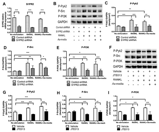 Osteoclastogenesis involves adhesion, followed by fusion of monocytes and macrophages [26]. Thus, we further analyzed the role of S1PR2 on podosome components, PI3K, Src, and Pyk2, which are protein kinases contributing to adhesion and fusion of BMMs [27]. Three days after lentiviral infection, the S1PR2 shRNA reduced the S1PR2 mRNA level by an average of 63.9% compared with control shRNA treatment (Figure 6A). The BMMs were unstimulated, cultured with RANKL, or co-cultured with RANKL and Aa-stimulated cell culture media for 1 h. As shown in Figure 6B–I, there were no significant differences in p-PI3K, p-Src, or p-Pyk2 protein levels in BMMs without stimulation between control shRNA versus S1PR2 shRNA treatment and vehicle versus JTE013 treatment. Treatment with RANKL or co-treatment with both RANKL and Aa-stimulated media significantly increased p-PI3K, p-Src, and p-Pyk2 in BMMs treated with either control shRNA or vehicle. In contrast, knockdown of S1PR2 by S1PR2 shRNA or inhibition of S1PR2 by JTE013 significantly reduced these protein kinase levels induced by RANKL alone or by co-culture by RANKL and Aa-stimulated cell culture media. The S1PR2 shRNA treatment decreased the average of protein levels of p-PI3K by 53.9%, p-Src by 40.6%, and p-Pyk2 by 58.2%, respectively, in BMMs stimulated by RANKL compared with control shRNA treatment. The S1PR2 shRNA treatment attenuated the average protein levels of p-PI3K. by 51.7%, p-Src by 34.9%, and p-Pyk2 by 43.6%, respectively, in BMMs co-cultured with RANKL and Aa-stimulated cell culture media. JTE013 (8 µM) decreased the average protein levels of p-PI3K by 52.9%, p-Src by 45.5%, and p-Pyk2 by 49.1%, respectively, in BMMs stimulated by RANKL compared with control vehicle treatment. JTE013 (8 µM) also attenuated the average protein levels of p-PI3K by 54.3%, p-Src by 30.7%, and p-Pyk2 by 35.1%, respectively, in BMMs co-cultured with RANKL and Aa-stimulated cell culture media.