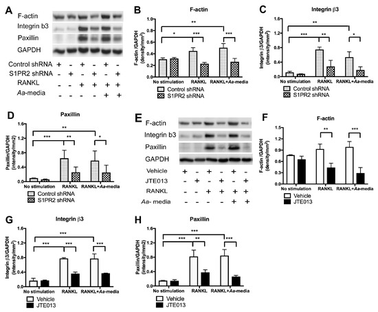 S1PR2 regulates podosome adhesive protein F-actin, integrin β3, and paxillin levels induced by RANKL with or without co-stimulated by Aa-stimulated media. Murine BMMs were treated with control shRNA/S1PR2 shRNA for one day or treated with vehicle/ JTE013 for 30 min. Then, cells were cultured in media containing M-CSF (50 ng/mL) alone or M-CSF with RANKL (250 ng/mL) for two days. On the third day, the media was changed with or without RANKL and/or JTE013. Some of the cells were co-cultured with both RANKL and Aa-stimulated media (Aa-media, 200 µL/mL) for another day. (A,E) F-actin, integrin β3, paxillin, and GAPDH protein expressions were evaluated by western blot. (B,F) F-actin protein density, (C,G) integrin β3 protein density, and (D,H) paxillin protein density were analyzed and normalized by GAPDH protein expression. (* p < 0.05, ** p < 0.01, *** p < 0.001).