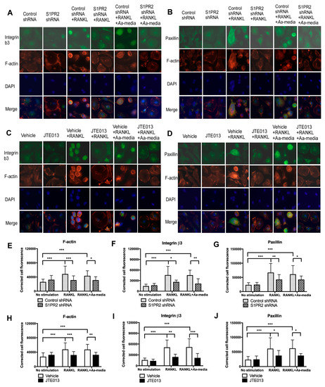 Immunofluorescence staining of integrin β3, F-actin, and paxillin in BMMs. Murine BMMs were treated with control shRNA/S1PR2 shRNA for one day or treated with vehicle/ JTE013 for 30 min. Then, cells were cultured in media containing M-CSF (50 ng/mL) alone or M-CSF with RANKL (250 ng/mL) for two days. On the third day, the media was changed with or without RANKL and/or JTE013. Some of the cells were co-cultured with both RANKL and Aa-stimulated media (Aa-media, 200 µL/mL) for another day. (A,C) show representative images of integrin β3, F-actin, and DAPI staining in BMMs (four to six cells per image). (B,D) show representative images of paxillin, F-actin, and DAPI staining in BMMs (four to six cells per image). (E,H) show cell fluorescence intensity of F-actin. (F,I) show cell fluorescence intensity of integrin β3. (G,J) show cell fluorescence intensity of paxillin. (* p < 0.05, ** p < 0.01, *** p < 0.001).