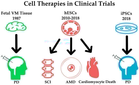The progression of pluripotent cell-based therapies within the context of Parkinson’s Disease (PD) research. Beginning in 1987, fetal ventral midbrain (VM) tissue used as the cell source for the first clinical trial using cells to treat PD. In recent years, human embryonic stem cells (hESCs) are being utilized in a number of clinical trials involving neurodegeneration. Use of hESCs has shown special promise in spinal cord injury (SCI), age-related macular degeneration (AMD) as well as cell damage to the heart. In the summer of 2018, clinicians are beginning to undertake the first human trial using induced pluripotent stem cells (iPSCs) as a cell source to treat PD []. This trial will follow seven patients over the course of two years. The outcomes of these trials are detailed in the text.