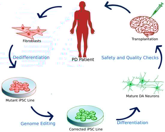 The first advantage is that iPSC lines can be established without the sacrifice of human embryos, removing a large ethical obstacle of human stem cell treatments. iPSCs also permit human leukocyte antigen (HLA) matches in patient-specific treatments, effectively reducing the severity of post-operational immunosuppressants. Histocompatibility has additionally shown a reduced immune response of lymphocytes and microglia as well as increased cell survival in iPSC transplantation of DAns in primate studies []. iPS dedifferentiation and reprogramming may be lengthy and burden the patient with high cost but reduced immune rejection and generic donor lines could significantly reduce costs when scaled up. The steps required for patient-specific transplantation of iPSCs are outlined in Figure 3. In Japan, researchers estimate that 50 iPS lines from HLA-homozygous donors will cover 73% of the Japanese population by matching three HLA loci (A, B and DR) []. Primate studies have already demonstrated significant improvements two years after transplanting human iPSCs into the non-human primate model of PD []. These human iPSC transplants into non-human primates functioned as midbrain DAns with improvement in scored movement. Similarly, postmortem analyses of iPSC transplants in non-human primate models reveal robust growth, proliferation and integration into existing neural networks [,]. Primate transplantation has also been achieved with clinical grade human ESCs and showed no significant tumor formation, as well as significant recovery of movement []. Clinical efficacy of treating PD with iPSC grafts in humans, however, will be established in the approaching future.
