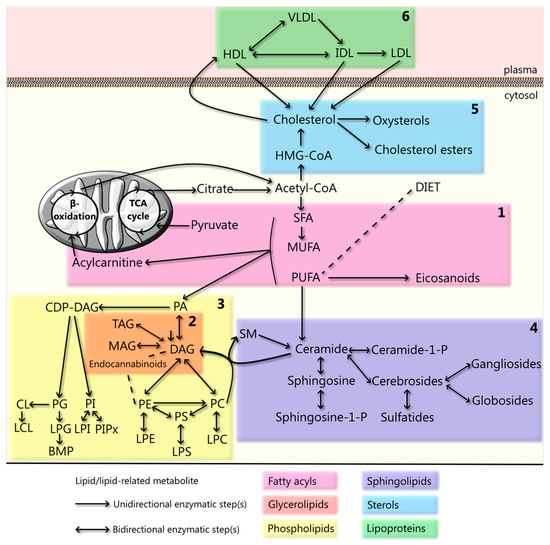 Cellular lipid metabolism and lipoprotein cycle. Schematic representation of lipid metabolism, whereby each colored box represents one lipid class: (1) fatty acyls, which include saturated (SFA), monounsaturated (MUFA), and polyunsaturated (PUFA) fatty acids, their mitochondrial-transporter, acylcarnitine, and the PUFA-derivatives eicosanoids; (2) glycyerolipids, including monoacylglycerol (MAG), diacylglycerol (DAG), and triacylglycerol (TAG), together with endocannabinoids (even though only some of them belong to this lipid class); (3) phospholipids, which include phosphatidic acid (PA), phosphatidylcholine (PC), phosphatidylserine (PS), phosphatidylethanolamine (PE), phosphatidylinositol (PI), phosphatidylglycerol (PG), cardiolipin (CL), and their lyso derivatives (lysoPC (LPC), lysoPS (LPS), lysoPE (LPE), lysoPI (LPI), lysoPG (LPG) and lysoCL (LCL)), and Bis(monoacylglycero)phosphate (BMP); (4) sphingolipids, including ceramide(-1-phosphate), sphingosine(-1-phosphate), sphingomyelin (SM), cerebrosides, sulfatides, gangliosides, and globosides; (5) sterols, which include the metabolites of cholesterol synthesis, such as β-hydroxy β-methylglutaryl-CoA (HMG-CoA), cholesterol, and its derivatives cholesterol esters and oxysterols; and (6) lipoproteins, including high-density lipoproteins (HDL), intermediate-density lipoproteins (IDL), low-density lipoproteins (LDL), and very low-density lipoproteins (VLDL). A depiction of the various lipid structures and of all the metabolic steps involved in their generation and interconversion(s) is given in Figures 2a,b–6a,b, respectively.