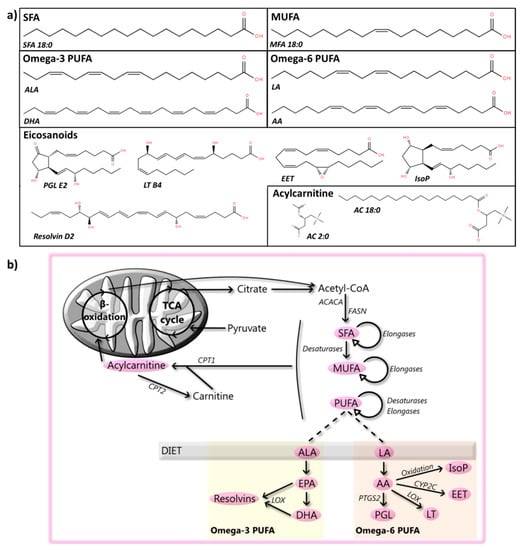 Fatty acyls: structures and metabolic steps involved. (a) Schematic representation of the chemical structures of fatty acyls, including saturated fatty acids (SFA 18:0), monounsaturated fatty acids (MUFA 18:1), omega-3 polyunsaturated fatty acids (PUFA, alpha-linoleic acid (ALA, top) and docosahexaenoic acid (DHA, bottom)), omega-6 PUFA (linoleic acid (LA, top) and arachidonic acid (AA, bottom)), eicosanoids (from left to right, prostaglandin E2 (PGL E2), leukotriene B4 (LT), 14,15-Epoxyeicosatrienoic acid (EET), 15-F2t-Isoprostane (IsoP), and resolvin D2 (bottom)), and acetylcarnitine (AC 2:0) and acylcarnitine (AC 18:0). Chemical structures are adapted from the LIPID MAPS structure database [25]. (b) Schematic overview of steps involved in the metabolism of fatty acyls, where fatty acids (FAs) can be obtained through the diet or by a multi-enzymatic reaction starting from acetyl-CoA and performed by enzymes such as acetyl-CoA carboxylase 1 (ACACA) and fatty acid synthase (FASN). Multiple steps of elongation, performed by elongases, and desaturation, carried out by desaturases, produce MUFA and PUFA. PUFA include, among others, omega-3 PUFA, such as ALA, which can be converted by a multistep reaction into eicosapentaenoic acid (EPA) and DHA, and omega-6 PUFA, including LA, which can be transformed by a multistep reaction to AA. PUFA can be further metabolized by enzymes such as lipoxygenase (LOX), prostaglandin-endoperoxide synthase 2 (PTGS2, also known as COX2), cytochrome p450 2C to various eicosanoids, including resolvins, PGL, LT, EET, or oxidized to isoP. Furthermore, transport of FA into mitochondria for their metabolism is preceded by their association with carnitine, which is catalyzed by the enzyme carnitine O-palmitoyltransferase 1 (CPT1) and reversed by carnitine O-palmitoyltransferase 2 (CPT2).
