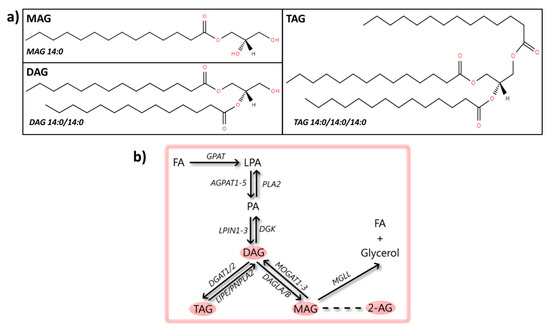 Glycerolipids: structures and metabolic steps involved. (a) Schematic representation of the chemical structures of glycerolipids, including monoacylglycerol (MAG 14:0), diacylglycerol (DAG 14:0/14:0), and triacylglycerol (TAG 14:0/14:0/14:0). Chemical structures are adapted from the LIPID MAPS structure database [25]. (b) Schematic overview of metabolic steps involved in the synthesis and conversion of glycerolipids: synthesis starts from fatty acids (FAs) by sequential conversion into LPA and PA, which are phospholipids (process described in Figure 4b). The enzyme phosphatide phosphatase (LPIN1-3) converts PA into DAG, a step that can be reversed by diacylglycerol kinase (DGK). From DAG, one FA can be added to the glycerol backbone by diacylglycerol O-acyltransferase 1/2 (DGAT1/2), creating TAG, a step that can be reversed by the hormone-sensitive lipase (LIPE) or patatin-like phospholipase domain-containing protein 2 (PNPLA2). Additionally, one FA can be removed from DAG by the enzyme sn1-specific diacylglycerol lipase alpha/beta (DAGLA/B), giving rise to MAG, which can be transformed back to DAG by 2-acylglycerol O-acyltransferase 1-3 (MOGAT1-3). One of the mostly studied MAG species is the endocannabinoid 2-arachidonoylglycerol (2-AG). MAG can be degraded to glycerol and a FA by monoglyceride lipase (MGLL).