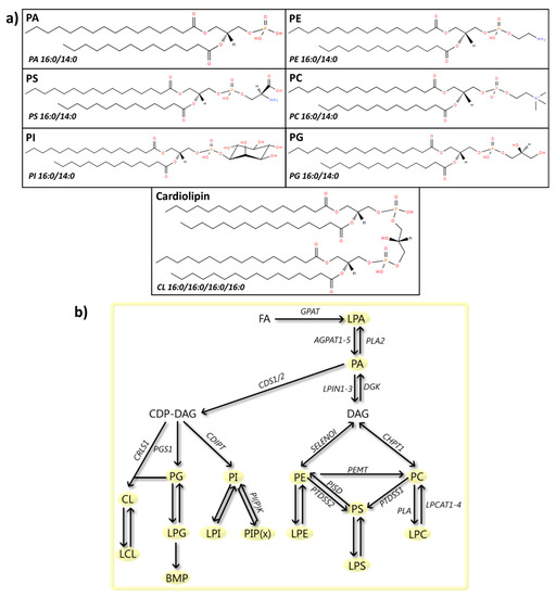Phospholipids: structures and metabolic steps involved. (a) Schematic representation of the chemical structures of phospholipids, including phosphatidic acid (PA 16:0/14:0), phosphatidylethanolamine (PE 16:0/14:0), phosphatidylserine (PS 16:0/14:0), phosphatidylcholine (PC 16:0/14:0), phosphatidylinositol (PI 16:0/14:0), phosphatidylglycerol (PG 16:0/14:0), and cardiolipin (CL 16:0/16:0/16:0/16:0). Chemical structures are adapted from the LIPID MAPS structure database [25]. (b) Schematic overview of phospholipid metabolism. Synthesis starts with the conversion of fatty acids into lysophosphatidic acid (LPA) by glycerol-3-phosphate acyltransferase (GPAT). LPA is then metabolized to PA by 1-acyl-sn-glycerol-3-phosphate acyltransferase 1-5 (AGPAT1-5), a reaction that can be reversed by phospholipase A2 (PLA2). PA can then be metabolized to diacylglycerol (DAG) (process described in Figure 3b), which can be subsequently transformed to PE by ethanolaminephosphotransferase 1 (SELENOI) or PC by cholinephosphotransferase 1 (CHPT1). PE can also be converted into PC by the enzyme phosphatidylethanolamine N-methyltransferase (PEMT). Both compounds can be precursors for the synthesis of PS by the enzymes phosphatidylserine synthase1/2 (PTDSS1/2). The conversion of PE to PS can be reversed by phosphatidylserine decarboxylase proenzyme (PISD). Additionally, PA can be metabolized by phosphatidate cytidylyltransferase 1/2 (CDS1/2) to cytidine diphosphate DAG (CDP-DAG), which can then be transformed to either PI, PG or CL, by CDP-diacylglycerol--inositol 3-phosphatidyltransferase (CDIPT), CDP-diacylglycerol--glycerol-3-phosphate 3-phosphatidyltransferase (PGS1) and cardiolipin synthase (CRLS1), respectively. PI can be phosphorylated by PI (phosphate) kinases (PI(P)K), to produce PI phosphate (PIP(x)). Moreover, all phospholipids can be metabolized to their lyso-forms (LPC, LPS, LPE, LPI, LPG, and LCL) by PLA2, a reaction reversed by lysophospholipid acyltransferases (LPCATs). LPG can be further metabolized to Bis(monoacylglycero)phosphate (BMP).