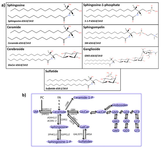 Sphingolipids constitute a family of lipids characterized by the presence of a sphingoid-base backbone. This complex family of compounds includes the sphingoid bases (e.g., sphingosine and sphingosine-1-phosphate), ceramides, phosphosphingolipids (e.g., sphingomyelin (SM)) and glycosphingolipids (e.g., cerebrosides, ganglisodes, and sulfatides) (Figure 5). Sphingolipids are not only structural components of cell membranes, but they also play a role in apoptosis, autophagy, and immune response [339]. Here, we will specifically focus on the involvement of sphingosine(-1-phosphate), ceramide, SM, cerebrosides, gangliosides, and sulfatides, and an overview is given in Supplementary Materials Table S1.