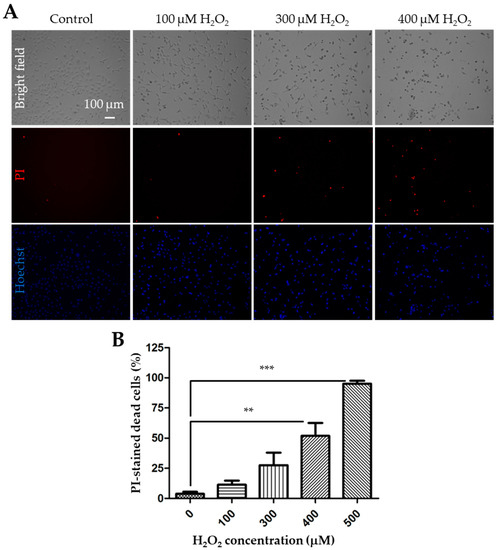 Exposure to H2O2 induces concentration-dependent cell death in SH-SY5Y cells. (A) Representative bright field and fluorescence images showing propidium iodide (PI) and Hoechst staining in control cells and cells after exposure to 100, 300 or 400 μM H2O2 for 24 h. (B) Mean ± standard error mean (SEM) percentage of cell death after exposure to indicated concentrations of H2O2 from 3 independent experiments. **, p < 0.01 and ***, p < 0.001, compared to control cells without exposure to H2O2.