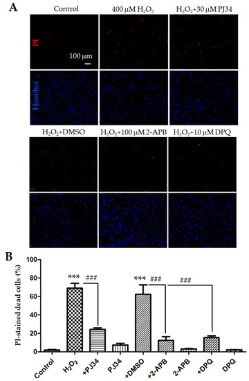 Effects of treatment with polymerase (PARP) or melastatin 2 (TRPM2) channel inhibitor on H2O2-induced cell death in SH-SY5Y cells. (A) Representative fluorescence images showing staining with PI and Hoechst of control cells and cells treated with indicated conditions. Treatment with the inhibitors or dimethyl sulfoxide (DMSO) started 30 min before and during exposure to 400 μM H2O2 for 24 h. (B) Mean ± SEM percentage of PI-positive cells under indicated conditions, as shown in panel A, from three independent experiments. ***, p < 0.001 compared with untreated cells, and ###, p < 0.001 compared to cells treated with H2O2 alone or treated with H2O2 and DMSO.