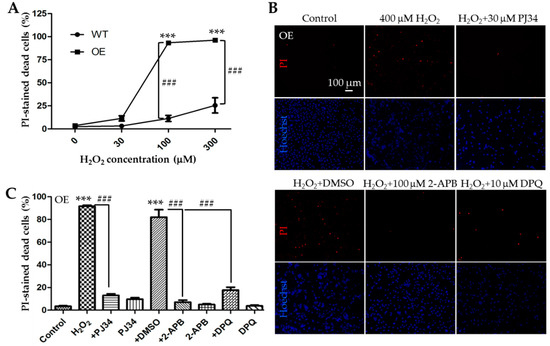 Cell death was examined using the PI staining assay as described in our previous studies [24,35]. In brief, cells were seeded in 24-well plates at 2 × 104 cells per well in 500 μL of standard culture medium and incubated overnight. After cells were treated with H2O2, PI, and Hoechst 33342 were added into the culture medium with the final concentrations of 2 μg/mL and 1 μg/mL, respectively. Cells were incubated at 37 °C for 30 min. In experiments examining the effects of inhibitors on H2O2-induced cell death, cells were treated with the inhibitor at indicated concentrations 30 min before and during exposure to H2O2. Images were captured using an AxioVert A1 fluorescence microscope (Zeiss). For each condition in every independent experiment, three wells of cells were used, one randomly selected field in each well was imaged, and at least 500 cells from three images/wells were analyzed. Cell death was presented as a percentage of PI-positive cells in all cells identified by Hoechst 33342 staining in the same fields.