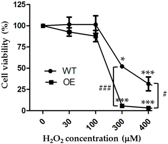 Increasing the TRPM2 expression in SH-SY5Y cell enhances H2O2-induced reduction in cell viability. Mean ± SEM cell viability, as a percentage of that under control conditions, in the WT and TRPM2-overexpressing (OE) cells after exposure to indicated concentrations of H2O2 for 24 h. The results were from three independent experiments. *, p < 0.05 and ***, p < 0.001, compared to cells without exposure to H2O2 in the WT or OE cells, respectively; #, p < 0.05 and ###, p < 0.001 compared between the WT and OE cells treated with the same concentration of H2O2.
