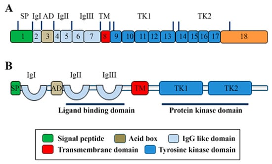 FGFR4 is one of four family members harboring tyrosine kinase (TK) domains. The human FGFR4 gene is located on the long arm of chromosome 5 (5q 35.1). The FGFR4 gene consists of 18 exons and has five transcript variants with three of them encoding the FGFR4 isoform 1 (Figure 1A) []. The 802 amino acid (aa) core region in the FGFR4 protein contains four parts, signal peptide (1–21 aa), extracellular region (22–369 aa), transmembrane region (70–390 aa), and the intracellular region (391–802 aa) (Figure 1B). Similar to the other three FGFR members, the extracellular region of FGFR4 consists of three immunoglobulin-like domains (IgI, IgII, and IgIII), which are essential for specific ligand-binding. IgI is located in 50–107 aa with a length of 97 aa. IgII and IgIII are located in order in 157–241 aa and 264–351 aa. Compared with the other three family members, FGFR4 does not have a splice variant on the IgIII []. Several ligand binding sites have been identified, such as 273, 278–280, 309–310, 316, and 337 aa. The TK domains locate in the C terminal from 454–767 aa with several tyrosine (Y) for autocatalysis, such as Y642, Y643, and Y764 (Figure 2).