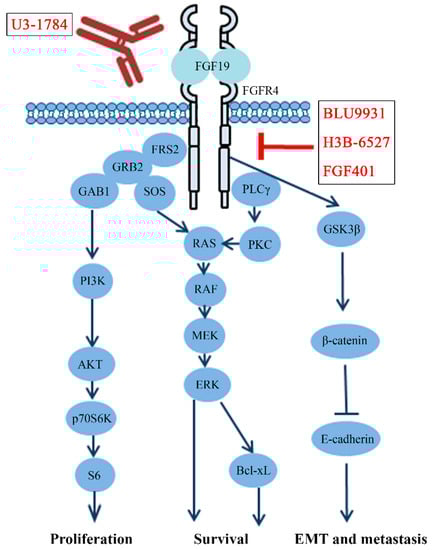 - Zhao, H.; Lv, F.; Liang, G.; Huang, X.; Wu, G.; Zhang, W.; Yu, L.; Shi, L.; Teng, Y. FGF19 promotes epithelial-mesenchymal transition in hepatocellular carcinoma cells by modulating the GSK3beta/beta- catenin signaling cascade via FGFR4 activation. Oncotarget 2016, 7, 13575–13586. [Google Scholar] [CrossRef]
