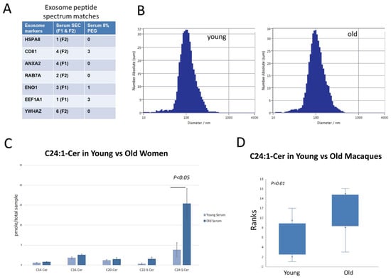 Lipidomic analyses of serum extracellular vesicles indicate that serum EVs from older women are highly enriched in C24:1 ceramide (15.4 pmol/sample) and differ significantly (p < 0.05) from younger women (3.8 pmol/sample) in this respect (Figure 1C). Similar to the human studies, EVs isolated from aged monkeys show a significant increase (p < 0.01) in C24:1 ceramide: 9.3 pmol/sample in old monkeys versus 1.8 pmol/sample in young monkeys (Figure 1D). Values for the non-human primate serum samples were similar to those of the women studies with increased amounts of C24:1 ceramide in older monkeys. These findings are clinically important since C24:1 ceramide is significantly elevated in the serum of older adults with lower cardiovascular fitness [], a higher risk of cardiovascular disease [], and memory impairment [].