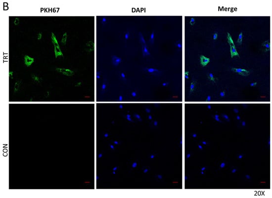 PKH67-labeled serum EVs are endocytosed by human bone marrow mesenchymal stem cells. EVs labeled with PKH67 (green, left and right columns) are endocytosed by cells visualized using confocal microscopy. Cells are shown at high (A, 40×) and lower (B, 20×) magnification. Images of cells treated with unlabeled (No PKH67 dye) are shown as controls (CON). Blue staining represents nuclear DAPI staining. Scale bars = 20 µm.