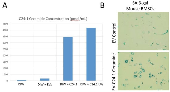 C24:1 ceramide (Cayman Chemical, MI) was dissolved in ethanol at a concentration of 1 mg/mL. The solubility of C24:1 ceramide in ethanol is approximately 5.5 mg/mL per manufacturer specifications. We loaded serum EVs isolated from a single mouse with ceramide by adding the EV pellet to the C24:1 ceramide solution, mixing vigorously, incubating at 30 °C for 1 h, purifying the EV pellet again, and then resuspending in de-ionized water (DIW). EVs are loaded effectively with C24:1 ceramide because it is highly hydrophobic. The ceramide-loaded EV suspension was centrifuged at 500× g for 5 min followed by 2000× g for 30 min at 4 °C to remove particles. The supernatant was removed, PEG solution added (8% PEG final concentration) and the sample incubated at 4 °C overnight. Samples were centrifuged the following day at 12,000 rpm for 1 h at 4 °C. The supernatant was then decanted and the resulting pellet was suspended in 200 μL of PBS. Control (unloaded) EVs were added to the ethanol solution that contained no C24:1 ceramide, sonicated, pelleted, and then resuspended in DIW. Lipidomic analysis on the ceramide-loaded EVs or unloaded (control) EVs was performed to verify effective loading. We then treated primary mouse BMSCs with the unloaded (control) serum EVs or EVs loaded with C24:1 ceramide. As an additional control we processed C24:1 ceramide in solution as we processed EVs. Cells were treated with 50ug/mL of exosomes, 10,000 Mouse BMSCs/well (24 well plate), or with the solution that included C24:1 ceramide but no EVs (Figure included as supplemental data). Primary BMSCs were isolated from femur bone marrow of adult mice 4–6 months age using procedures we have described previously [,,]. Cells were stained for senescence-associated beta-galactosidase (β-gal) as a marker of cell senescence.
