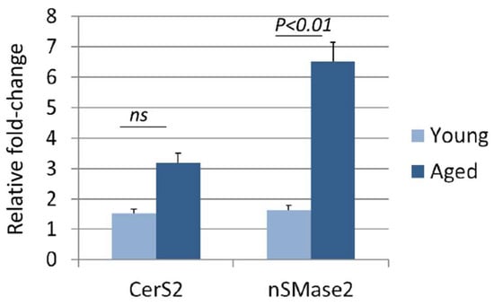 The liver is the primary source of circulating ceramide [,]. Ceramide can be produced in the liver in two ways, either by de novo synthesis or by hydrolysis of sphingomyelin []. Ceramide synthase 2 (CerS2) is the primary synthase involved in synthesizing very long-chain C24:1 ceramide through the de novo pathway [,], whereas neutral sphingomyelinase 2 (nSMase2) is primarily involved in the production of ceramide by hydrolysis of sphingomyelin []. We therefore compared the expression of CerS2 and nSMase2 between the livers of aged (22 mo, n = 4) and young (6 mo, n = 4) adult female mice to determine which pathway may be involved in the elevated C24:1 ceramide observed with age. Livers were snap frozen in liquid nitrogen after mice were euthanized by CO2 overdose and thoracotomy. mRNA was isolated from livers using RNeasy spin columns (Qiagen) following manufacturer specifications. qRT-PCR was performed using the following primer sequences with the average of GAPDH and 18s RNA expression as the normalization control. CerS2 FWD AAGTGGGAAACGGAGTAGCG, CerS2 REV ACAGGCAGCCATAGTCGTTC, nSMase2 FWD ACACGACCCCTTTCCTAATA, nSMase2 REV GGCGCTTCTCATAGGTGGTG.